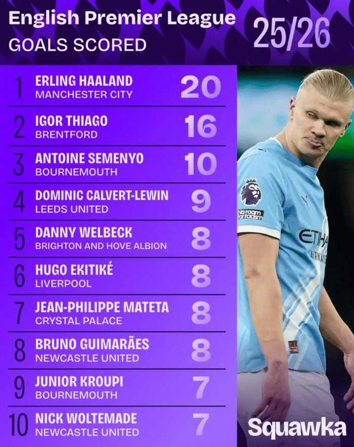 2026-01-11 18:40:08哈兰德本赛季五大联赛首破20球,蒂亚戈创英超巴西球员进球纪录